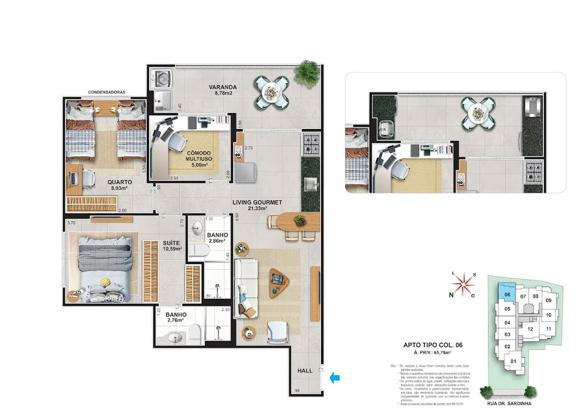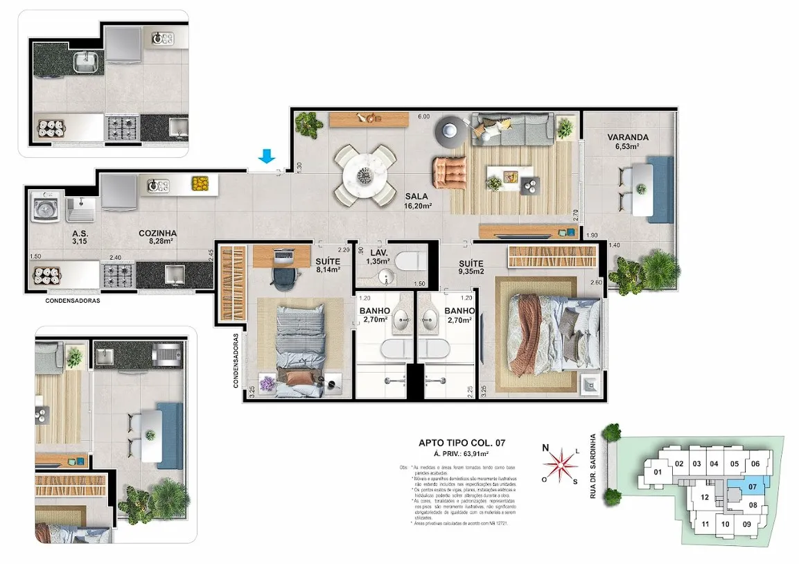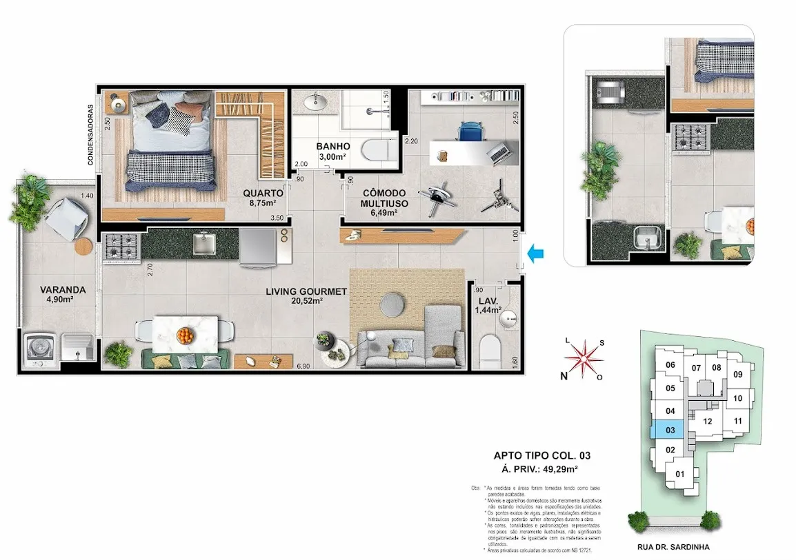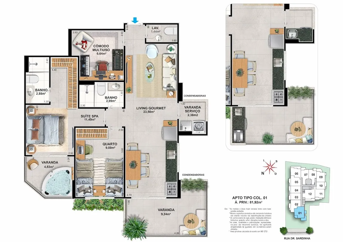 - Varanda Gourmet: kit vendido separadamente, contendo bancada com churrasqueira tipo cooktop a gás e bancada com tanque inox nas áreas de serviço. Nas colunas 01, 07 e 08, o kit incluirá também uma pia na bancada da churrasqueira