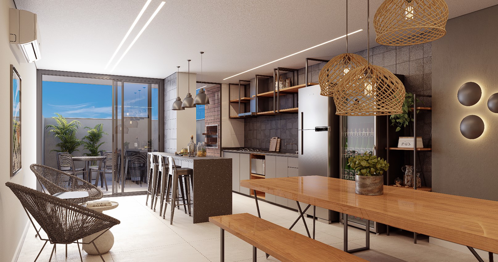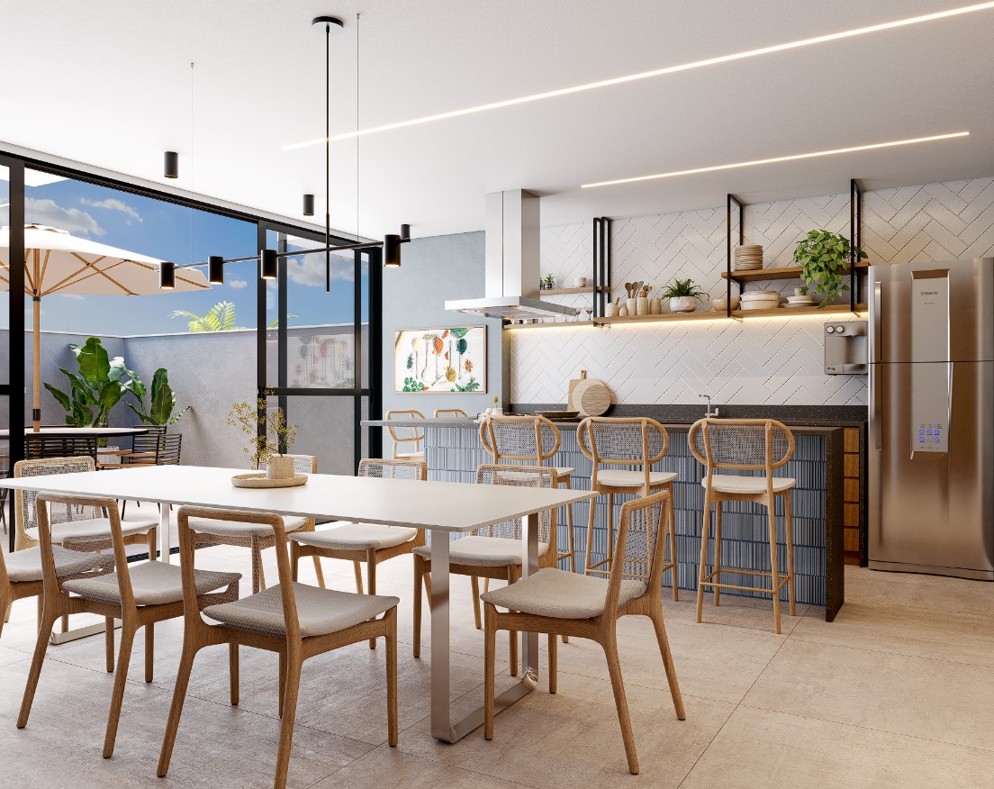 Com sala, cozinha e varanda com churrasqueira a gás integrados, criamos um espaço onde não há limites entre os cômodos.