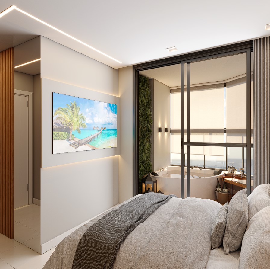 Suíte exclusiva e completa, com closet, varanda e uma banheira. Um verdadeiro spa privativo, dentro do quarto.